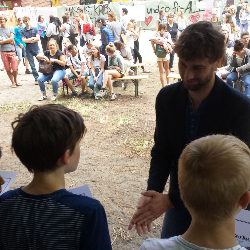 Zu Besuch beim Sommerfest der Weißenseer Heinz-Brandt-Schule. Ganz besonders gefreut habe ich mich über eine Gruppe von Schüler*innen der 7., 8. Und 10. Klasse, die vom höchsten Berg Berlins zur Zugspitze gefahren sind. 870 km. Mit dem Fahrrad. In 12 Tagen! Dafür gab es für Alle erstmal eine Auszeichnung.